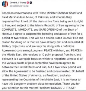 Trump ha reso noto l’annuncio attraverso la sua piattaforma Truth Social, dichiarando che la tregua potrebbe rappresentare un’occasione per permettere alla diplomazia internazionale di avviare un processo negoziale più ampio.