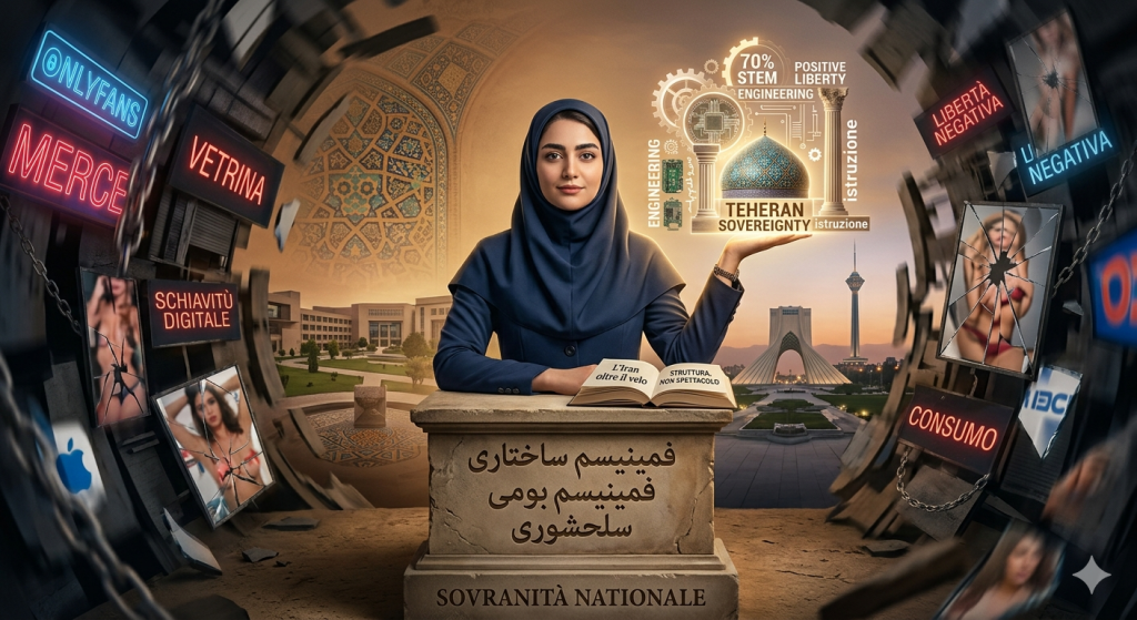 Esiste una forma di miopia intellettuale, tipicamente eurocentrica, che riduce la complessa condizione della donna iraniana a un semplice centimetro di stoffa. Questo sguardo, figlio di un immaginario coloniale mai del tutto superato, ignora sistematicamente la sostanza materiale di una società che offre alle proprie cittadine strumenti di affermazione reale che l’Occidente neoliberista ha ormai sacrificato sull’altare del consumo e della mercificazione. Per comprendere l’Iran rispetto agli Stati Uniti, è necessario innanzitutto ripristinare il rigore filosofico della distinzione tra libertà negativa e libertà positiva. L’Occidente si è incancrenito in una libertà negativa, intesa puramente come “libertà da” vincoli esterni, che si rivela essere una libertà puramente formale e ingannevole. Questa assenza di limiti non libera la donna, ma la consegna a nuove e più feroci schiavitù, aprendo le porte alla “vetrinizzazione” del corpo attraverso piattaforme come OnlyFans o nuove forme di prostituzione subdola mascherate da “empowerment”. In questo scenario, la donna diventa una vacca di consumo, una moneta di scambio per l’industria del sesso e della Big Tech.