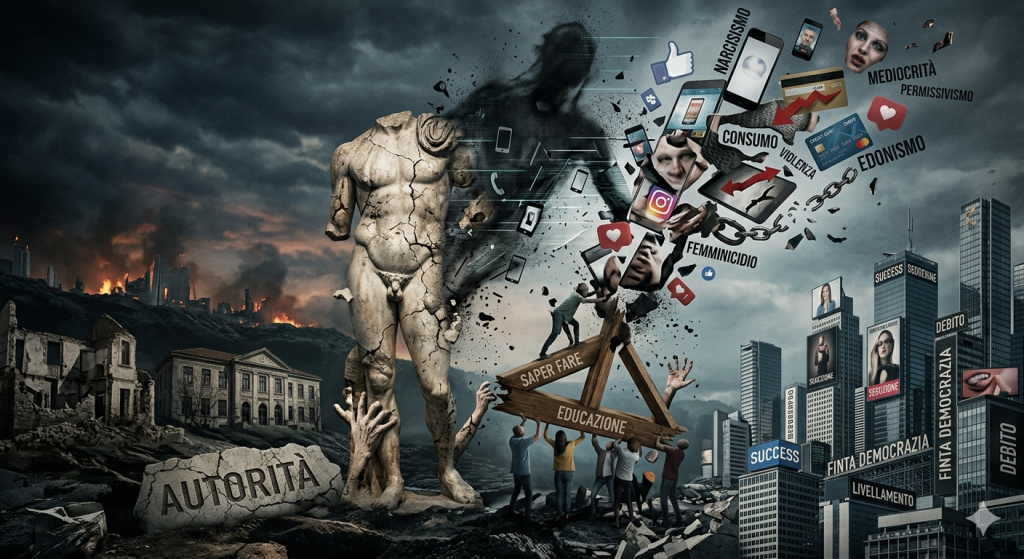 Siamo testimoni di una decomposizione che non è solo economica o politica, ma profondamente antropologica e materiale. Quello che viviamo non è un progresso liberatorio, ma un’implosione silenziosa che sta divorando le fondamenta stesse del vivere civile e della conoscenza. Se un tempo l’educazione era il motore dell’ascesa sociale e il terreno dello scontro ideale, oggi è diventata il recinto di una mediocrità programmata, un “corpo putrescente” che attende solo di esalare l’ultimo respiro.