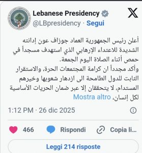 Aoun ha inoltre messo in guardia contro l’incitamento all’odio, l’accusa di apostasia e l’esclusione settaria, definendoli le minacce più gravi per società che emergono da lunghi conflitti. Il presidente libanese ha infine espresso le sue condoglianze al presidente siriano Ahmed al-Sharaa, al governo e al popolo siriano, rinnovando il sostegno del Libano alla Siria nella sua guerra contro il terrorismo e nel percorso verso uno Stato basato su libertà, democrazia, modernità e tolleranza, elementi considerati fondamentali per una Siria unita e per la sicurezza strategica dell’intera regione.